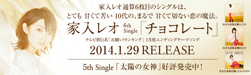 | ◆ 【家入レオ】デビューシングル「サブリナ」タイアップ決定! [2011.12.12] デビュー・シングル「サブリナ」がフジテレビ系列にて放送中のTVアニメ『トリコ』 2012年エンディング主題歌に決定。2012年1月8日よりOAスタート! あわせて、書き下ろしジャケット仕様のトリコ盤(1万枚完全生産限定盤)の発売も追加決定し、 シングル「サブリナ」は初回盤・通常盤・トリコ盤の3タイトルとして2012年2月15日リリース! ≫ フジテレビ系列TVアニメ『トリコ』オフィシャルサイト 【サブリナの15秒SPOTも公開スタート】 「サブリナ」予告篇に続いて、本日12日より「サブリナ」15秒SPOTがいよいよ公開! 12月21日には着うた先行配信もスタートします! ≫ 家入レオ オフィシャルサイト |